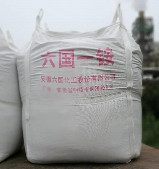 3、印刷字样:吨袋前后写上”六国一铵”四个大字,下面写上厂址,字体颜色为红色字体。